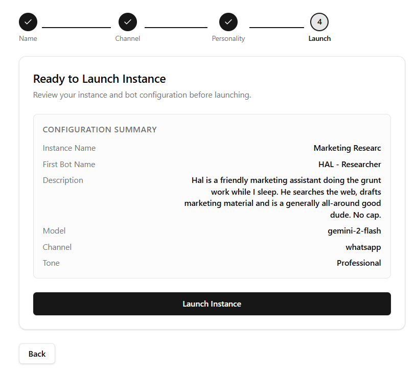 The moment you create your bot, EverClaw gives you a live chat window right in your browser. No WhatsApp number. No Telegram token. No channel setup at all.